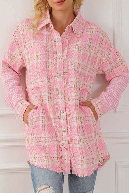 Pink Houndstooth Splicing Oversized Tweed Shacket