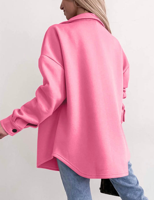 Pink Solid Colored Pocketed Button Up Long Sleeve Shacket
